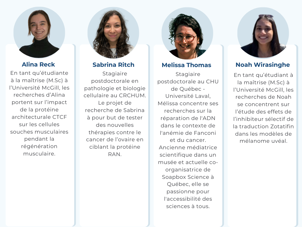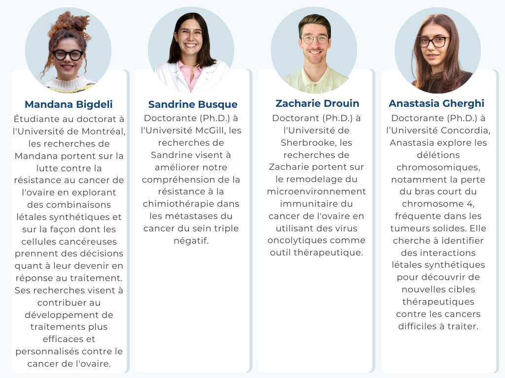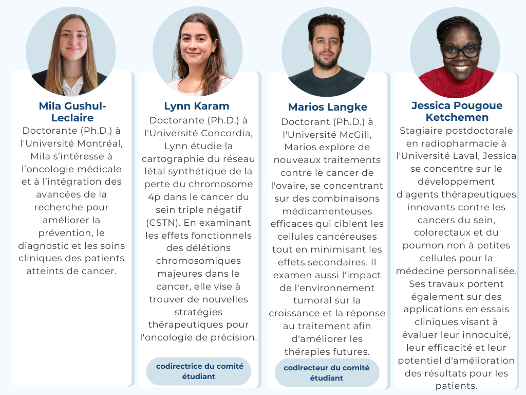 RRCancer est fier de présenter son comité étudiant. Ce groupe d’étudiants et de chercheurs postdoctoraux constitue un canal de communication privilégié entre la communauté étudiante et la gouvernance du réseau. Son mandat est de représenter les membres étudiants de RRCancer et de participer à la création de nouvelles opportunités de recherche..