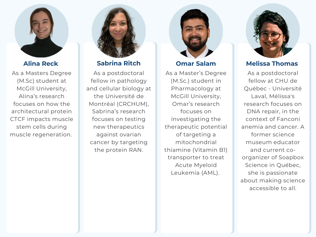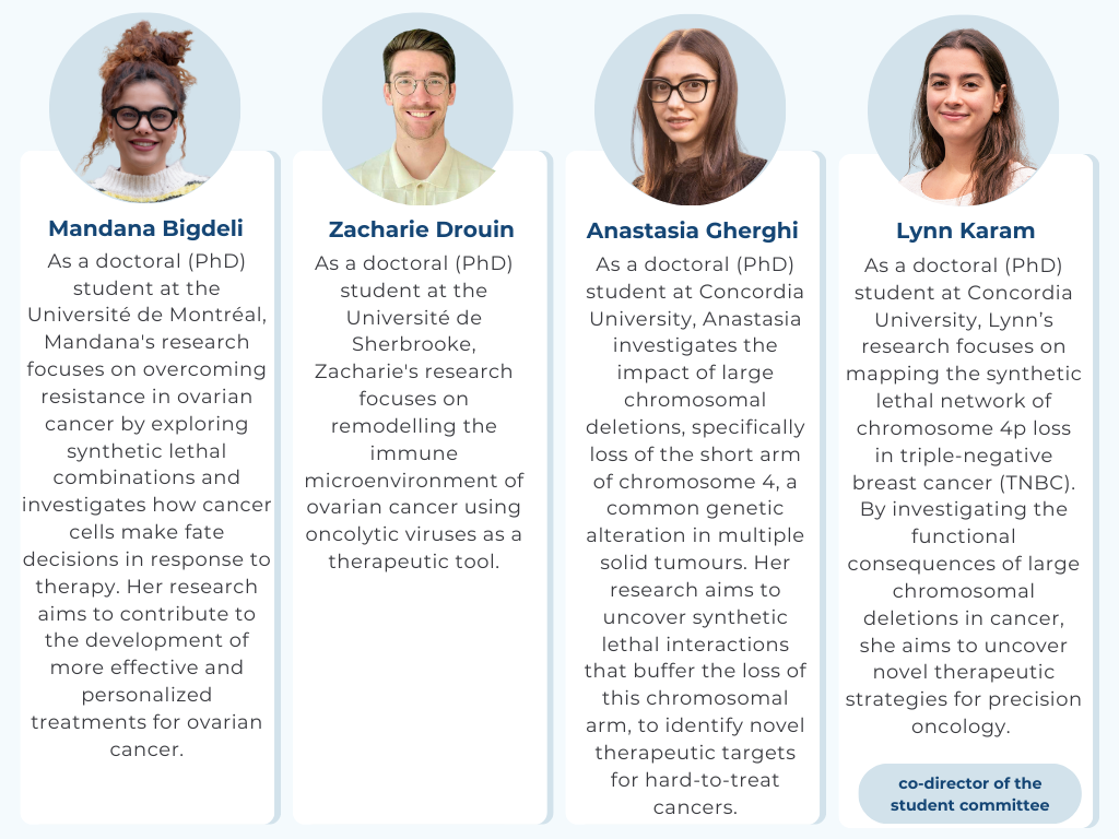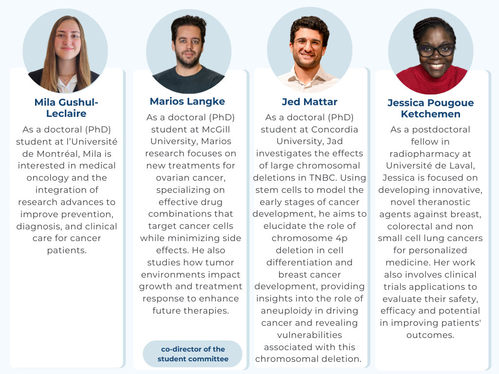 RRCancer is proud to introduce its student committee. This group of students and postgraduate fellows serve as a privileged channel of communication between the student community and the network’s governance. Its mandate is to represent the RRCancer student members and to participate in the creation of new research opportunities.